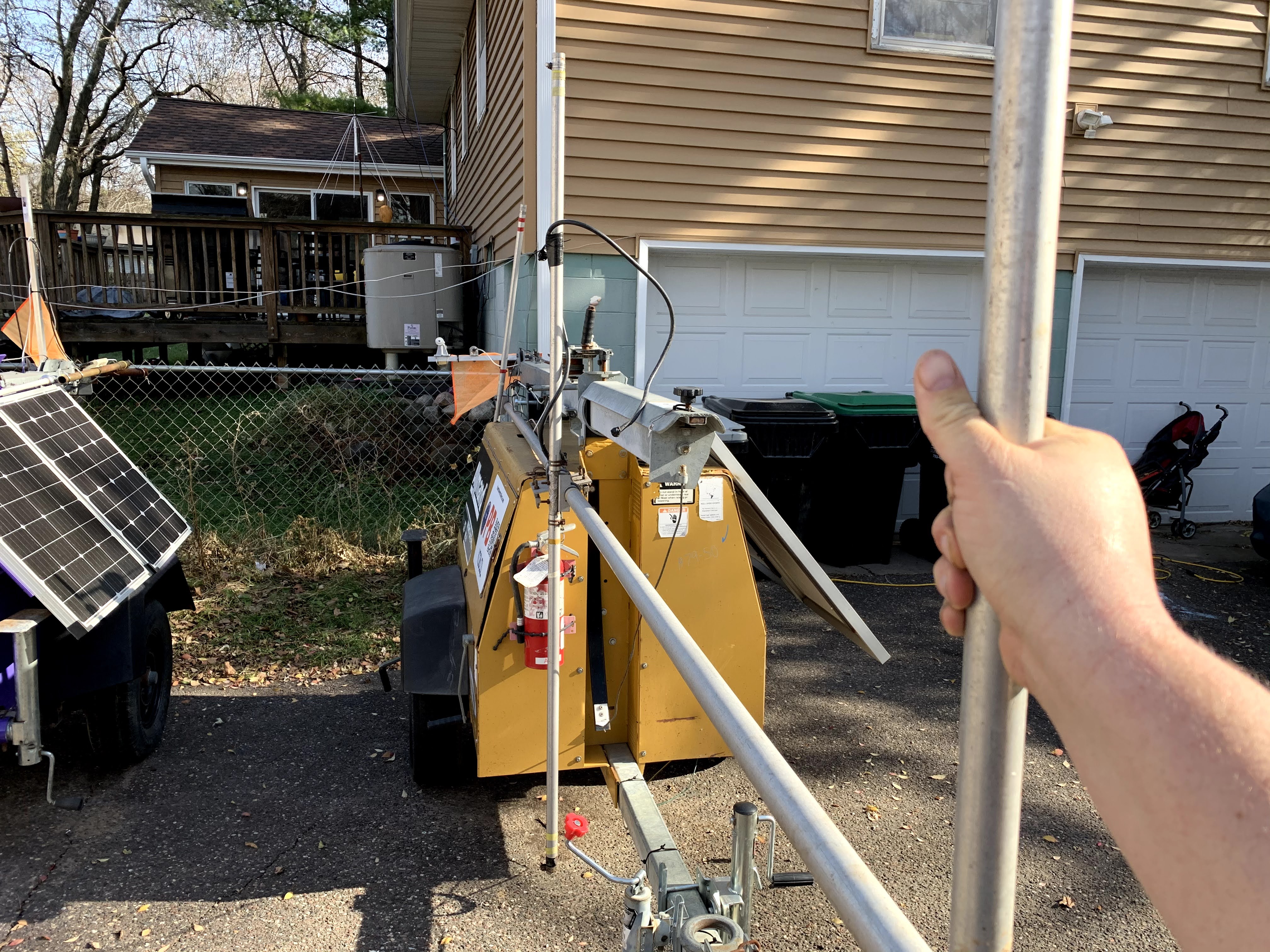 Other possible considerations include that the antenna is tall enough a stepladder may also be required to set it up. On bigger tower trailers this has also been the case – however, their starting elevation is higher so setting it up at a 90 degree angle is possible. These light towers can only accommodate the length of the antenna by being partially elevated while slanted sideways, which may be more difficult. We will give this a try in 2021!