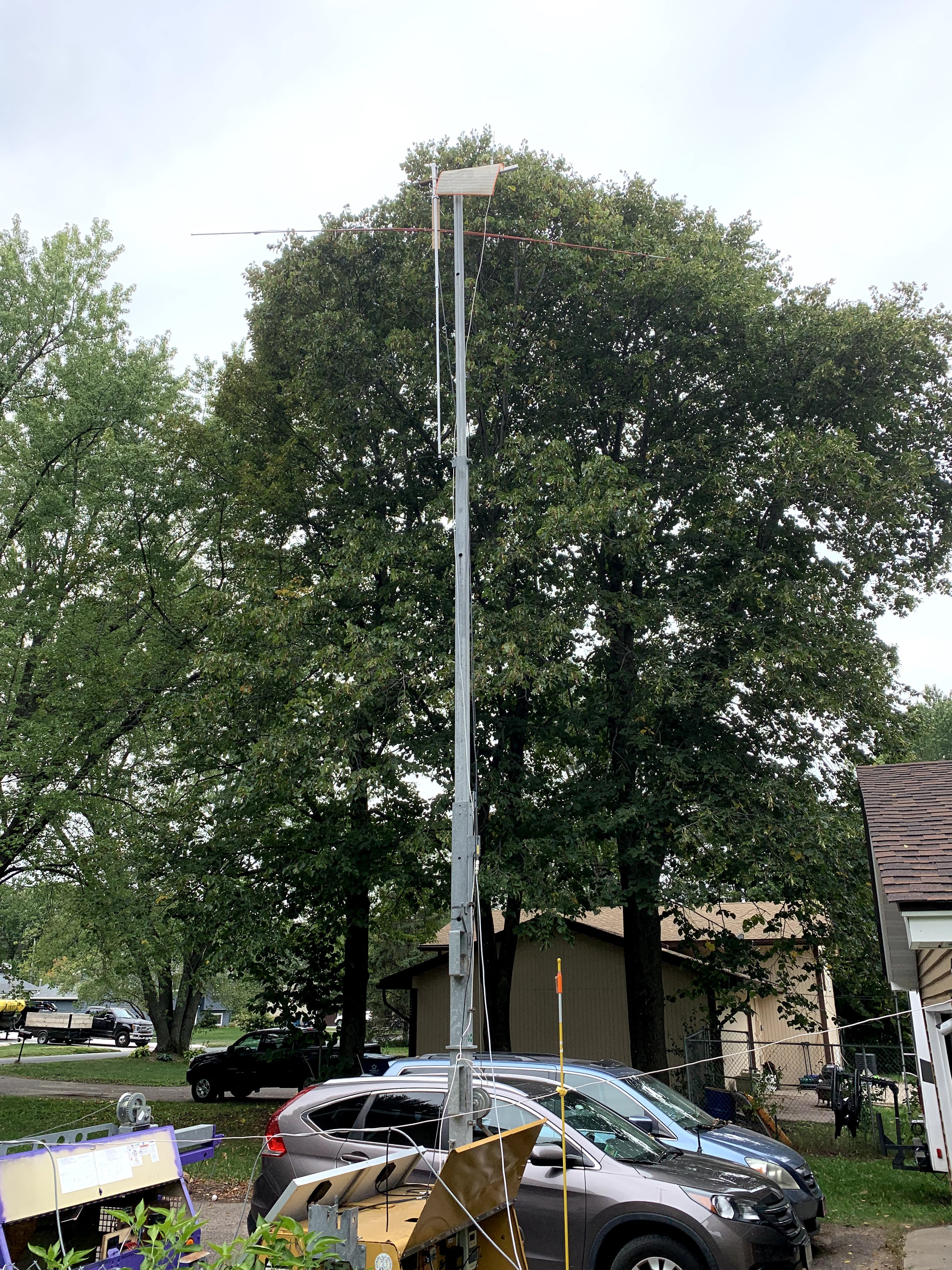 This simple dipole was able to get out and reach stations on 2M and 6M that the high-gain vertically polarized antennas just couldn’t get, several contacts between 90-180 miles on digital (FT8) with this little thing and 35 watts. The 2M vertical normally deployed with the tower trailer dangles downward, as it’s not needed for horizontal polarization.