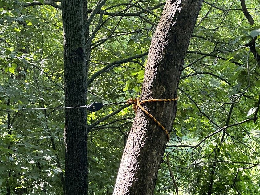 - Half-wave End-fed antenna tied to tree trunks, only as far overhead as one can reach:
