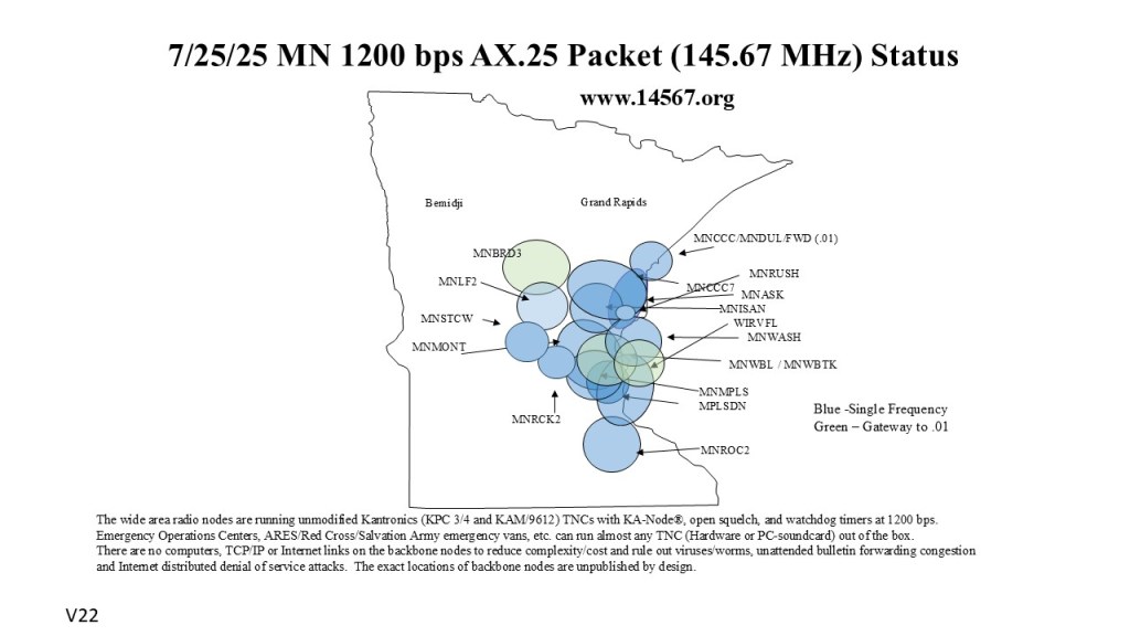 We run a good sized (~20 stations, covers most of the population centers in the area) “plain” AX.25 packet network in Minnesota. Actually we are involved in several networks- there is 145.01, APRS(r) and even some 9600 packet. Once in while we get access to a promising /free node site (elevated- could be a building roof etc.) with no access to AC mains power.